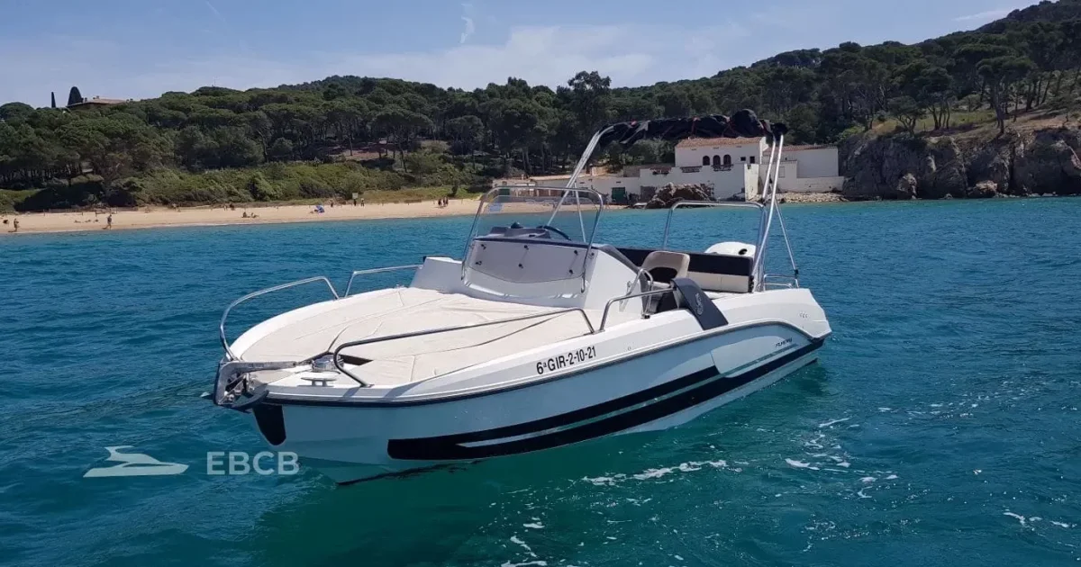 With this boat, you can sail comfortably and explore Palamós and its surroundings. Its 7-meter length makes it ideal for 8 people. You can relax on the spacious bow sundeck and enjoy a snack in the cockpit, which has seating and a table. This boat also has a large cabin where you can store your belongings or relax inside. From Palamós, one of the stops we can make is Aiguablava Beach, located south of Fornells. It is the last beach in Begur, and with its crystal-clear waters, it is one of the most beautiful beaches in Begur.